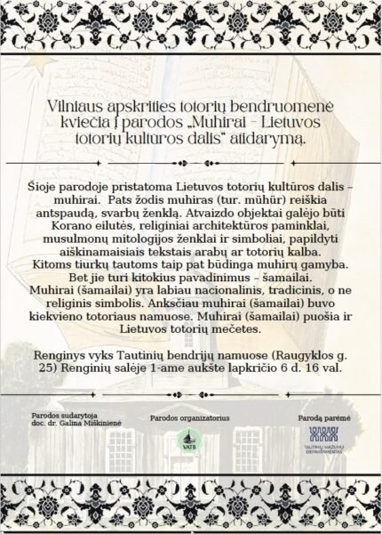 2025-11-04 In Naujienos Comment off Vilniaus apskrities totorių bendruomenė kviečia į parodos „Muhirai – Lietuvos totorių kultūros dalis“ atidarymą.