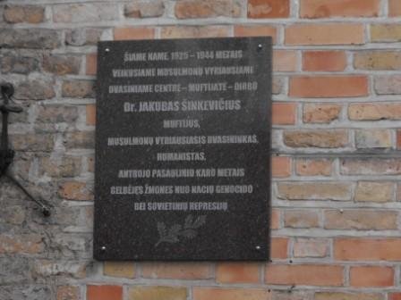 Granito plokštėje iškalti žodžiai: „Šiame name 1925 – 1944 metais veikusiame musulmonų vyriausiame dvasiniame centre – muftijate – dirbo dr. Jakubas Šinkevičius muftijus, musulmonų vyriausiasis dvasininkas, humanistas, Antrojo pasaulinio karo metais gelbėjęs žmones nuo nacių genocido bei sovietinių represijų“.