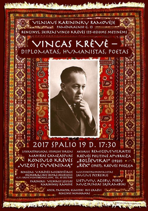 2017 m. spalio 19 d., ketvirtadienį, 17.30 val. Vilniaus įgulos karininkų ramovėje (Pamėnkalnio g. 13) įvyks vakaras, skirtas Vinco Krėvės 135-osioms gimimo metinėms ir artėjančiam Nepriklausomos valstybės atkūrimo šimtmečiui paminėti. Renginyje „Vincas Krėvė – diplomatas, humanistas, poetas“ svečiuosis Lietuvos azerbaidžaniečių bendrijos pirmininkas ir Vinco Krėvės gyvenimo bei kūrybos tyrinėtojas Mahiras Gamzajevas. Vakaro svečias, remdamasis Azerbaidžano ir Lietuvos archyvų dokumentais, skaitys pranešimą Konsulo Krėvės „vizos į gyvenimą“, kuriame pristatys beveik nežinomą Vinco Krėvės veiklą, susijusią su jo diplomatiniu darbu Azerbaidžane nuo 1919 iki 1920 m., tuo papildydamas pasaulinės diplomatijos istoriją naujais faktais. Ištiesti pagalbos ranką, išduodant žmonėms lietuviškus kilmės dokumentus, kurie gintų juos ir suteiktų jiems teisę sugrįžti į nepriklausomą Lietuvą buvo vienas svarbiausių Vinco Krėvės kaip konsulo Azerbaidžane uždavinių. Ši veikla tapo ypač rizikinga, Azerbaidžaną užgrobus bolševikams. Renginio metu talentingas lietuvių aktorius Remigijus Vilkaitis naujai interpretuos ir šiuolaikiškai perteiks Vinco Krėvės politinę apybraižą „Bolševikai“, pirmą kartą paskelbtą 1920 m. laikraštyje „Tauta“, redaguotame Juozo Tumo-Vaižganto. Išskirtinę muzikinę programą „Sąskambiai“, sukurtą interpretuojant lietuvių, azerų ir persų muziką, vakaro svečiams padovanos multiinstrumentalistas Saulius Petreikis. Ateik, pamatyk, sužinok! Renginys nemokamas.
