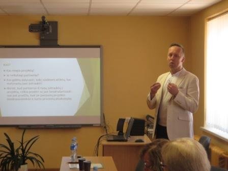 Tautinių mažumų departamento prie Lietuvos Respublikos Vyriausybės Ryšių su tautinėmis bendrijomis skyriaus vyriausiasis specialistas Sigitas Šliažas pateikė išsamias, turiningas ir vaizdingas rekomendacijas kaip parengti projektus įvairioms institucijoms bei fondams siekiant gauti paramą organizacijos veiklai vystyti. Taip pat supažindino su informacija apie kultūros projektų, skatinančių tautinių mažumų kultūrų plėtotę, dalinio finansavimo iš valstybės biudžeto lėšų, konkursą, kurį organizuoja Tautinių mažumų departamentas.