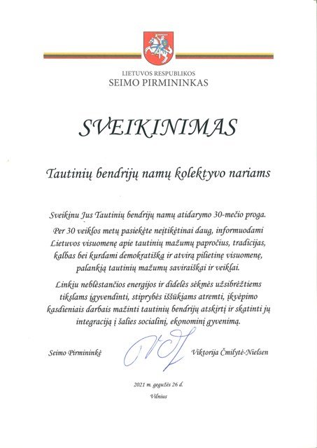 Seimo pirmininkė pasveikino Tautinių bendrijų namus