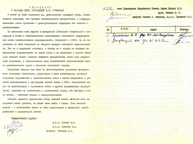 Kreipimesi – atsakyme SSSR Prezidentui Michailui Gorbačiovui, rusakalbiai Lietuvos piliečiai atsakingai pareiškia, kad Lietuvos valstybingumo atstatymas vyksta be smurto ir diskriminacijos. Jiems nereikalinga jų teisių gynyba karine jėga, todėl geriausia parama būtų besąlygiškas Lietuvos Respublikos suvereniteto pripažinimas derybos su veikiančiu, laisvai išrinktu parlamentu, siekiant išsaugoti ir vystyti ekonominius ir kultūrinius ryšius tarp Lietuvos ir SSSR.