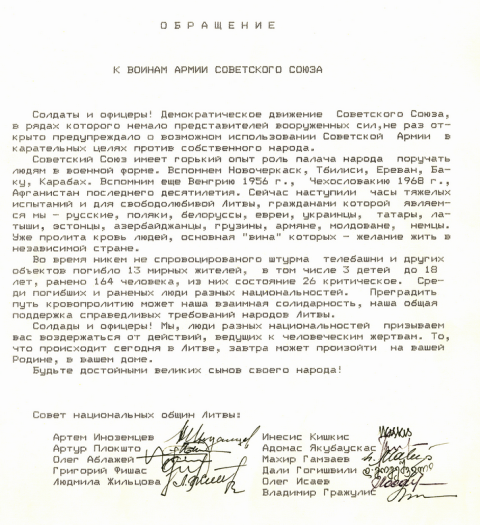 Lietuvos tautinių bendrijų kreipimesi pabrėžiama, kad demokratinis judėjimas ne kartą atvirai perspėjo, kad prieš savo liaudį gali būti panaudota Sovietinė armija. Taip įvyko šturmuojant televizijos bokštą, kuomet žuvo 13 taikių gyventojų, kurių tarpe įvairių tautybių žmonės. Jų vienintelė „kaltė“ – noras gyventi nepriklausomoje šalyje. Kviečiama susilaikyti nuo veiksmų, kurie atves prie žmonių aukų.