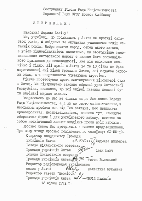 Kreipiamasi į Borisą Oleiniką ne tik kaip į SSSR Aukščiausios Tarybos Tautybių Tarybos pirmininko pavaduotoją, bet ir kaip į ukrainiečių tautos atstovą, prašant nutraukti kraujo praliejimą.